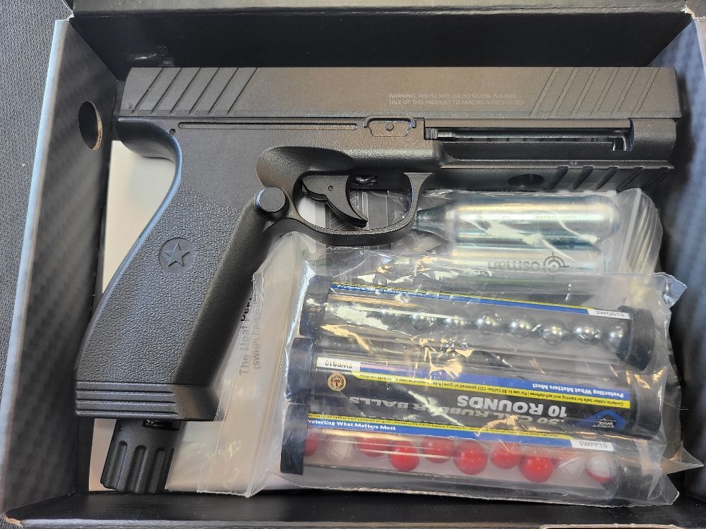 comes with 10 shot of rubber shot, 10 shot of steel shot, and 10 shot of pepper balls
